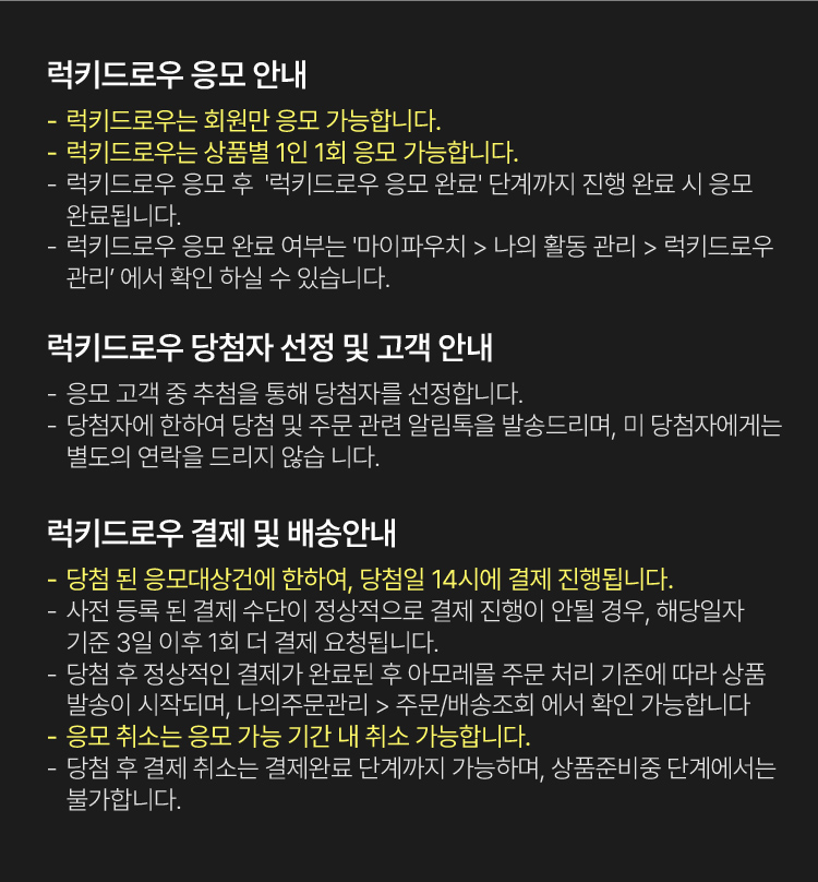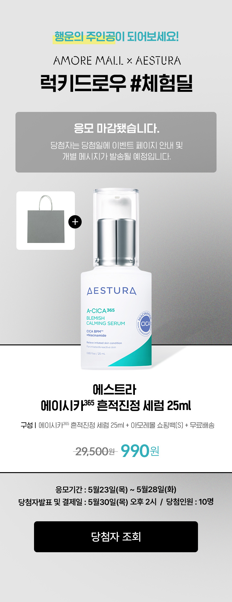 당첨 후 정상적인 결제가 완료된 후 아모레몰 주문 처리 기준에 따라 상품이 발송되며, 나의주문관리_주문/배송조회에서 확인가능합니다.