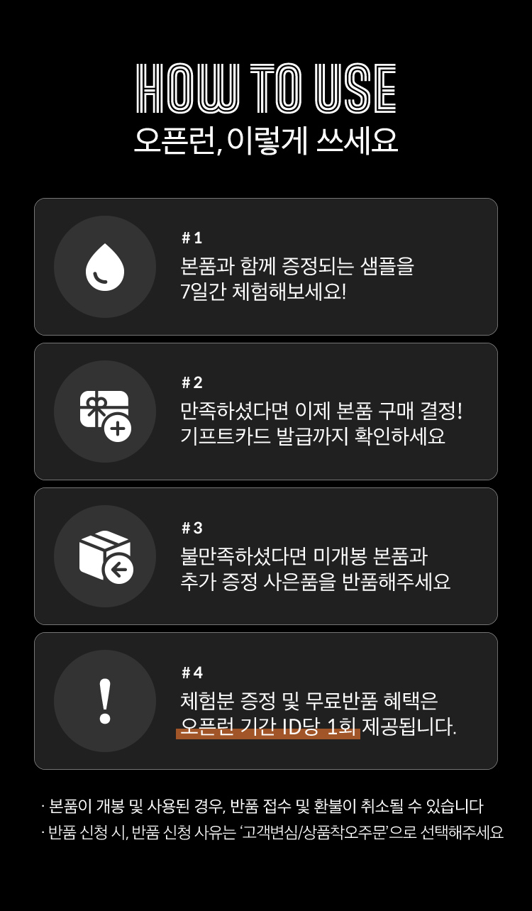 오픈런 체험용 샘플은 해당 상품에만 제공되며 주문당 1회 / id당 1회만 제공됩니다.