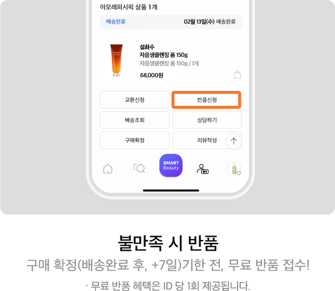 반품 신청은 배송완료일+7일까지로 구매확정 완료 이후에는 신청하실 수 없습니다.
