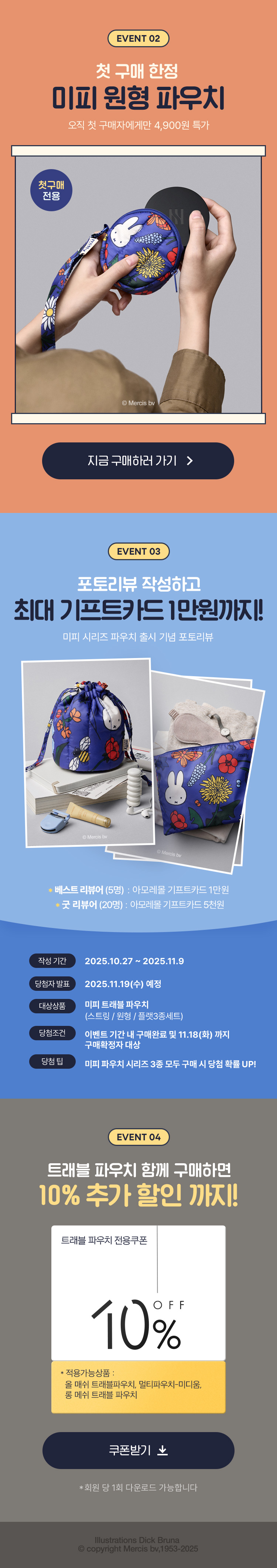 미피 파우치는 한정수량으로 조기 소진 시, 예고없이 행사 종료 될 수 있습니다.