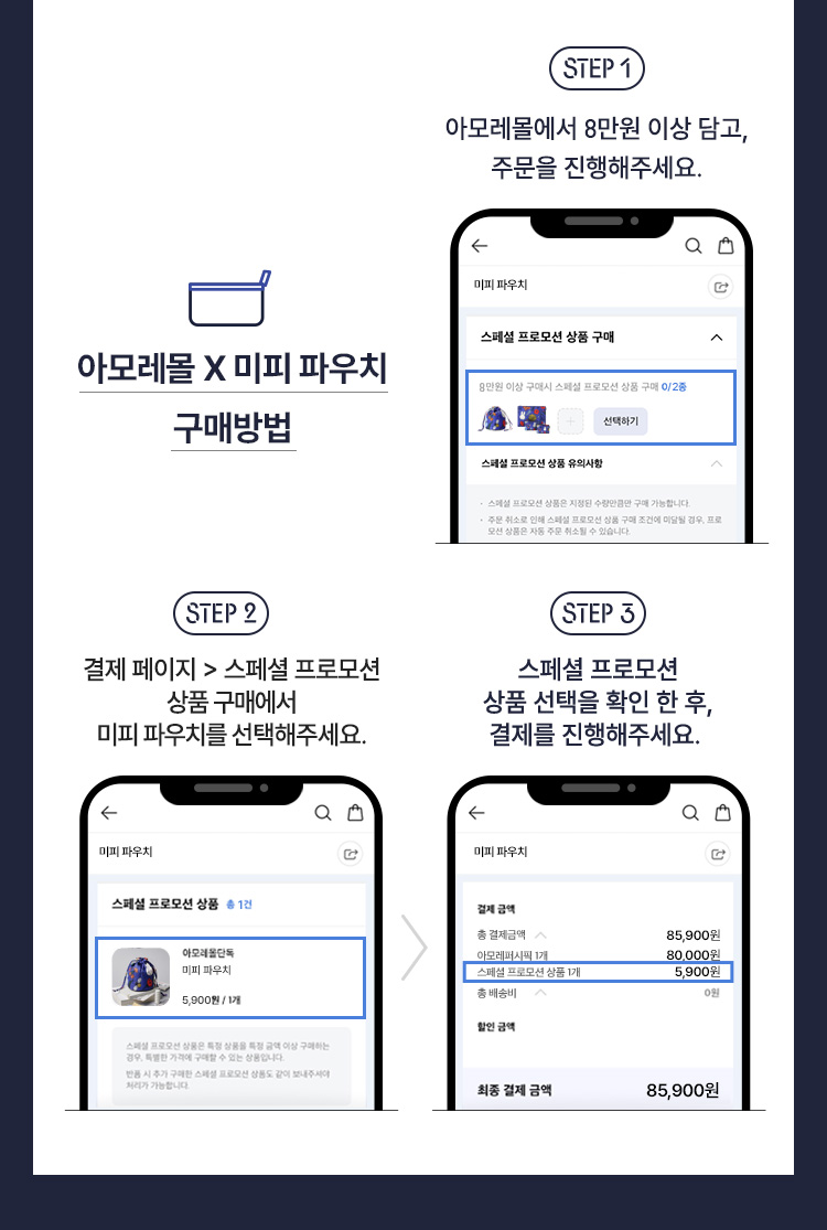 미피 파우치는 특가 구매 조건 충족 시, 결제 단계에서 직접 추가 선택하셔야 하며, 주문 완료 후 주문상세에서도 적용여부 재 확인이 가능합니다.