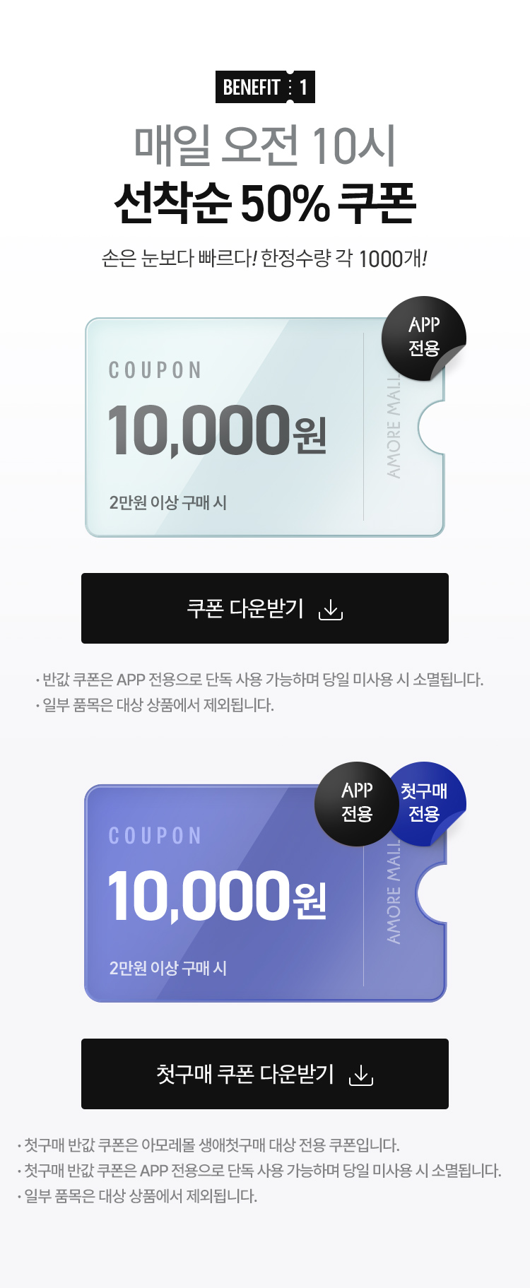 선착순 첫구매 반값쿠폰은 매일 오전10시부터 선착순으로 다운로드 가능하며, 한정수량 1,000개 소진 시 발급종료됩니다.