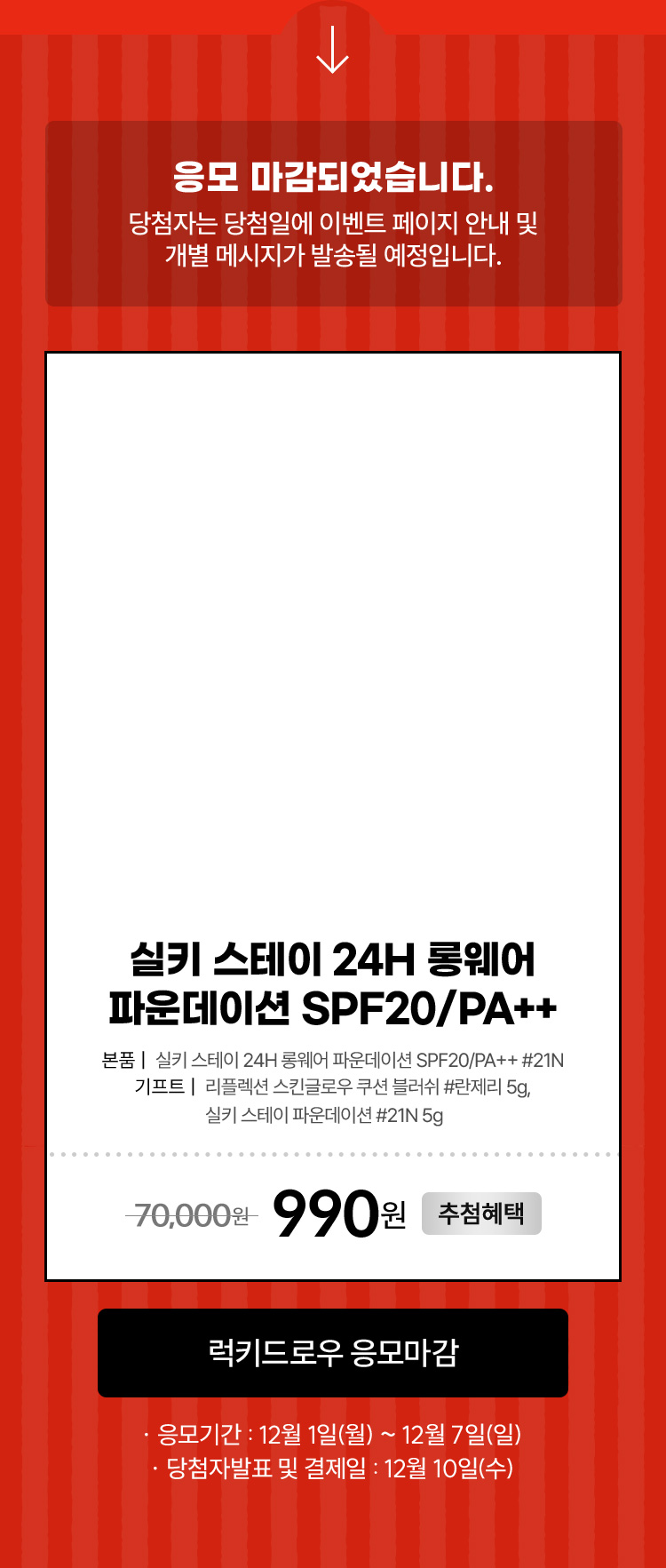 럭키드로우 응모 후 '럭키드로우 응모 완료' 단계까지 진행 완료 시 응모 완료됩니다.