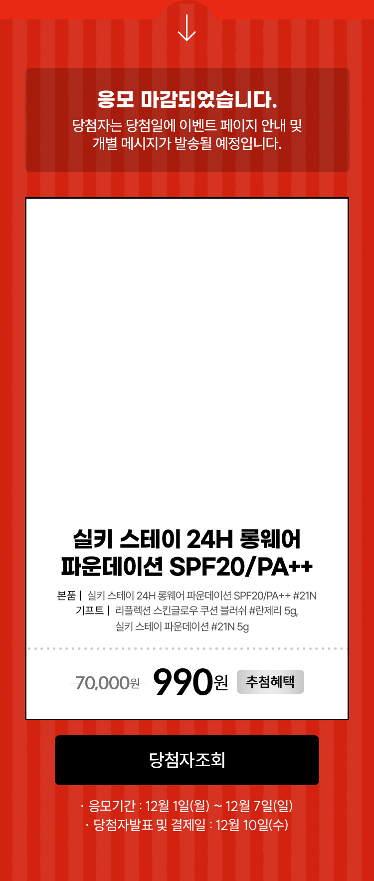 당첨 후 정상적인 결제가 완료된 후 아모레몰 주문 처리 기준에 따라 상품이 발송되며, 나의주문관리_주문/배송조회에서 확인가능합니다.