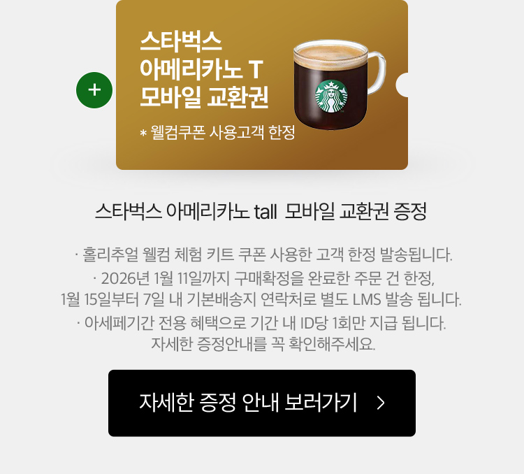 BEST 5종 체험 키트 증정 및 스타벅스 아메리카노 모바일 교환권 증정, 구매금액대 사은품 증정 혜택은 12월 8일부터 23일까지 운영되는 아세페 기간 내 혜택입니다. 기간 내 중복 적용되지 않습니다.