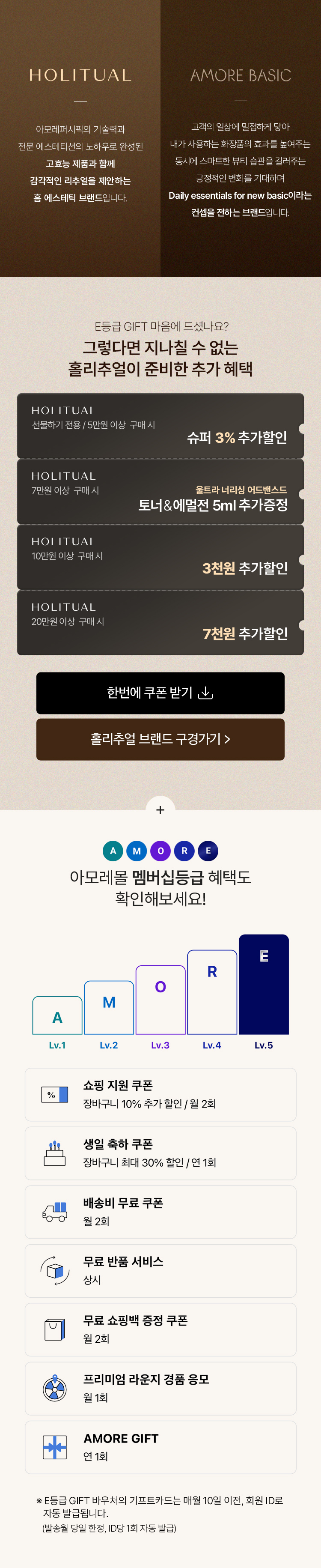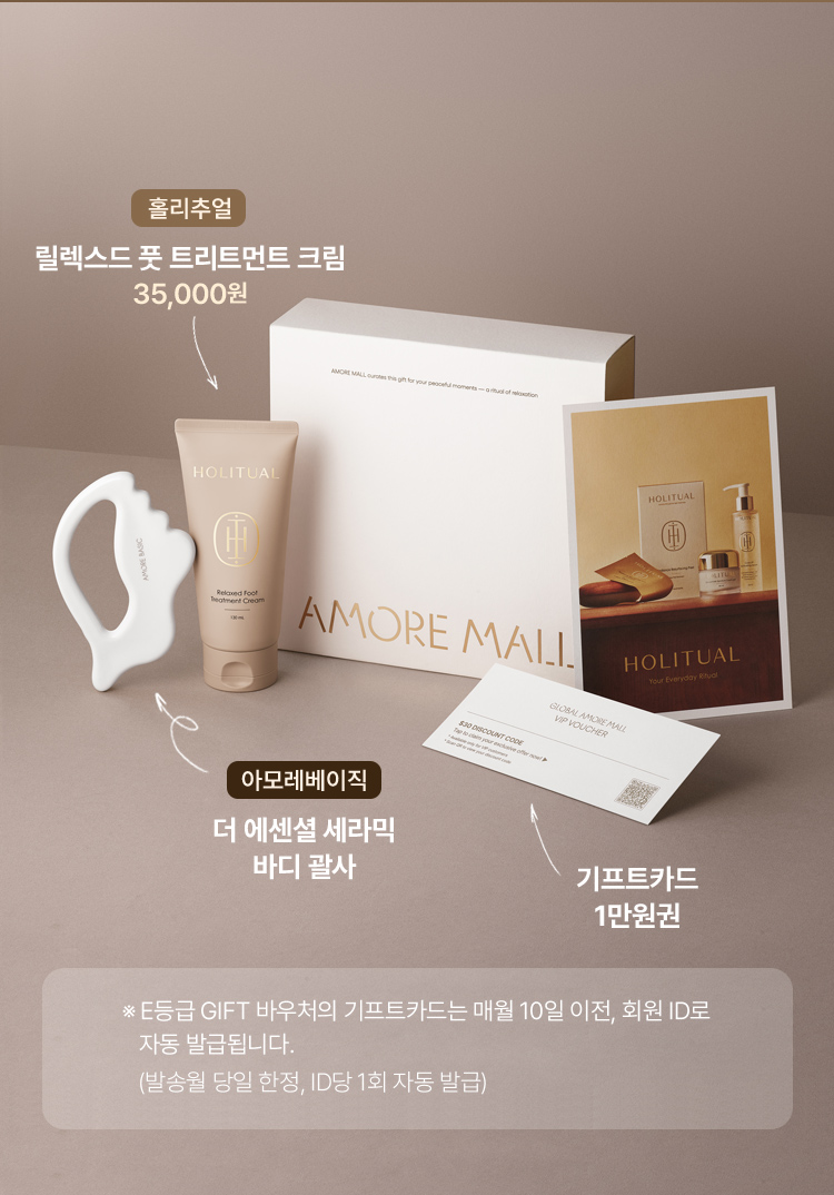 E등급 AMORE GIFT는 아이디당 연 1회 받아보실 수 있으며, 첫 E등급 달성 월에 발송됩니다.