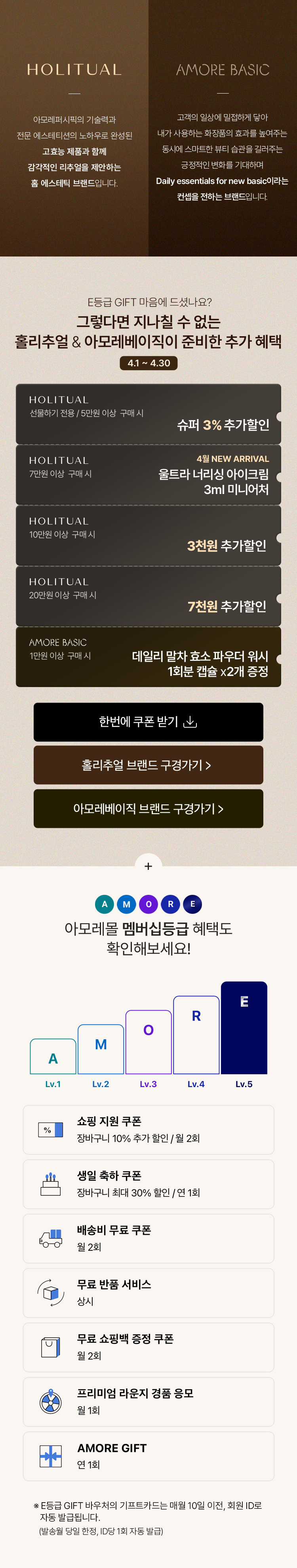 E등급 AMORE GIFT는 아이디당 연 1회 받아보실 수 있으며, 첫 E등급 달성 월에 발송됩니다.