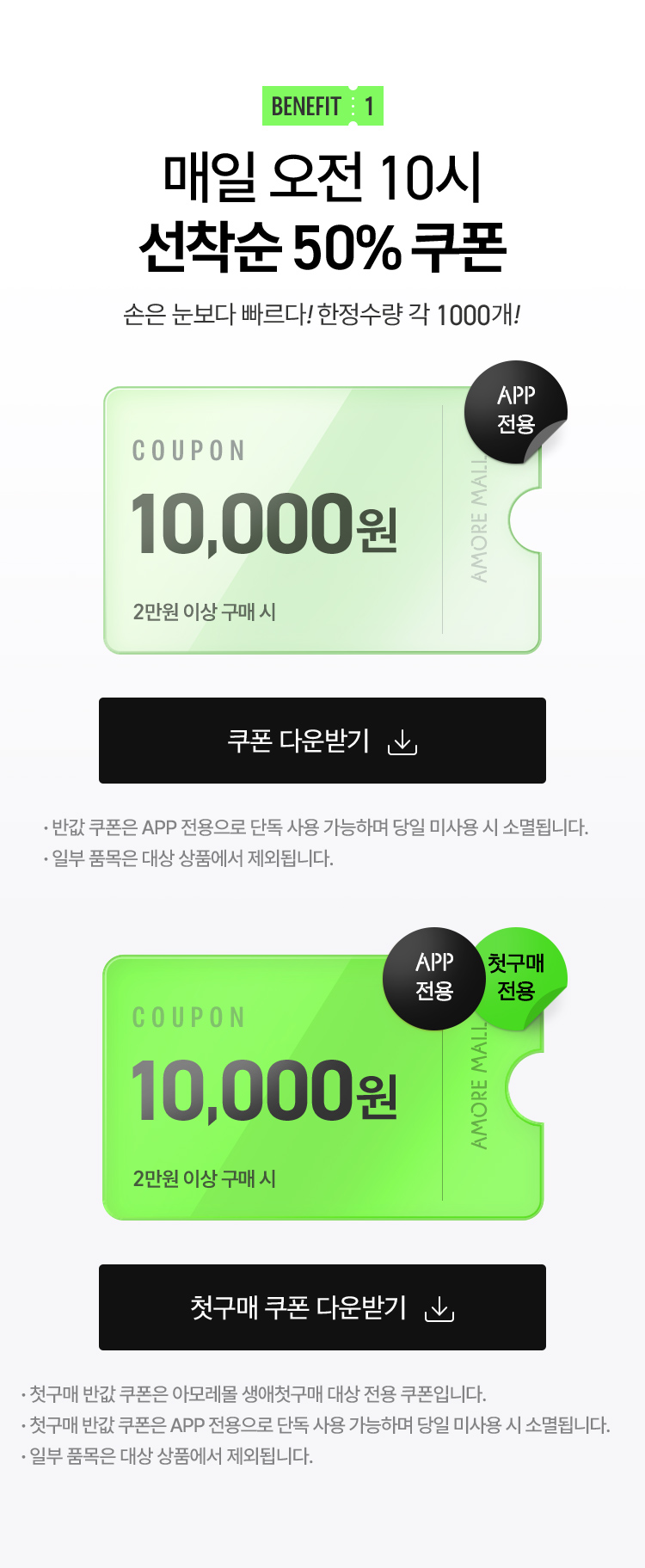 선착순 첫구매 반값쿠폰은 아모레몰에서 구매를 한 번도 하지 않은 생애첫구매 고객 전용 대상 쿠폰입니다.