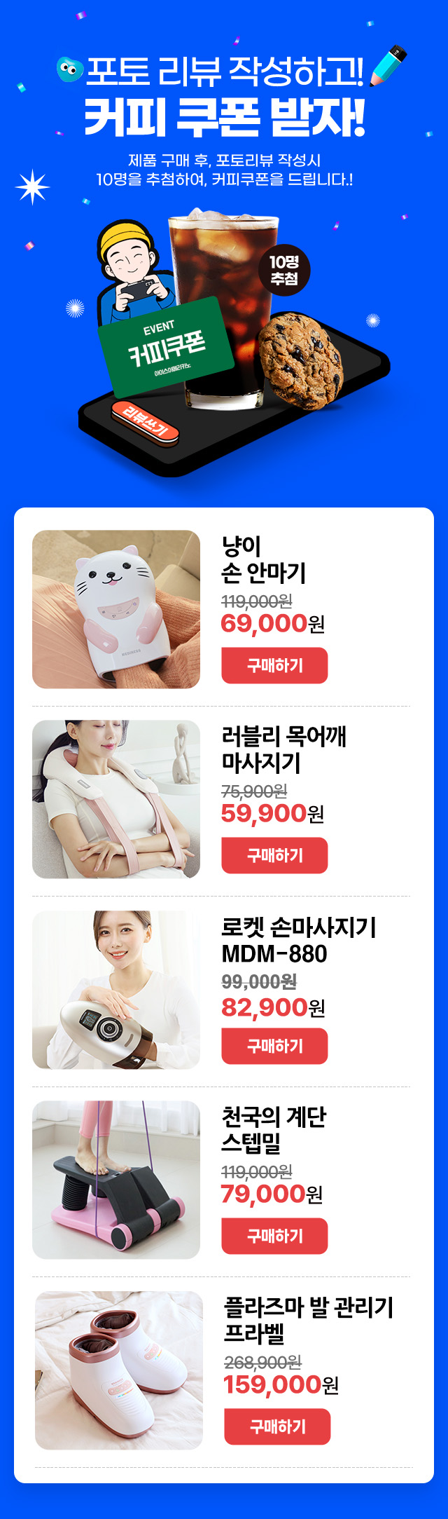 대상상품 : 냥이 손안마기, 러블리 목어깨 마시지기, 로켓손 마사지기, 천국의계단 스텝밀, 플리즈마 발관리기 프라벨