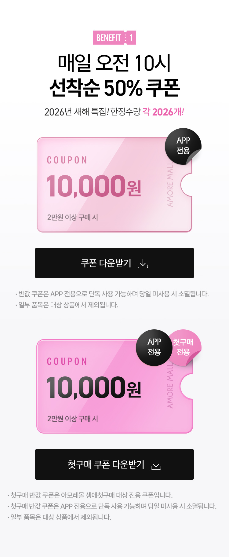 선착순 첫구매 반값쿠폰은 매일 오전10시부터 선착순으로 다운로드 가능하며, 새해특집 한정수량 2,206개 소진 시 발급종료됩니다.