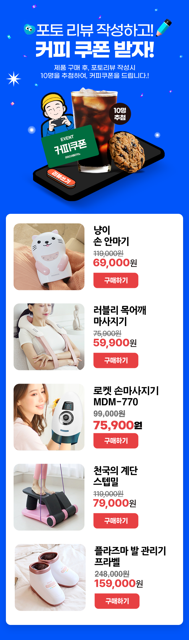 대상상품: 타이거 손목 마시지(핑크/블루), 애플쿠션(민트), 버블쿠션(레드/골드/블랙/화이트), 무선공기압 슬랜더 발다리 마시지기,클라우드 발관리기(블랙)