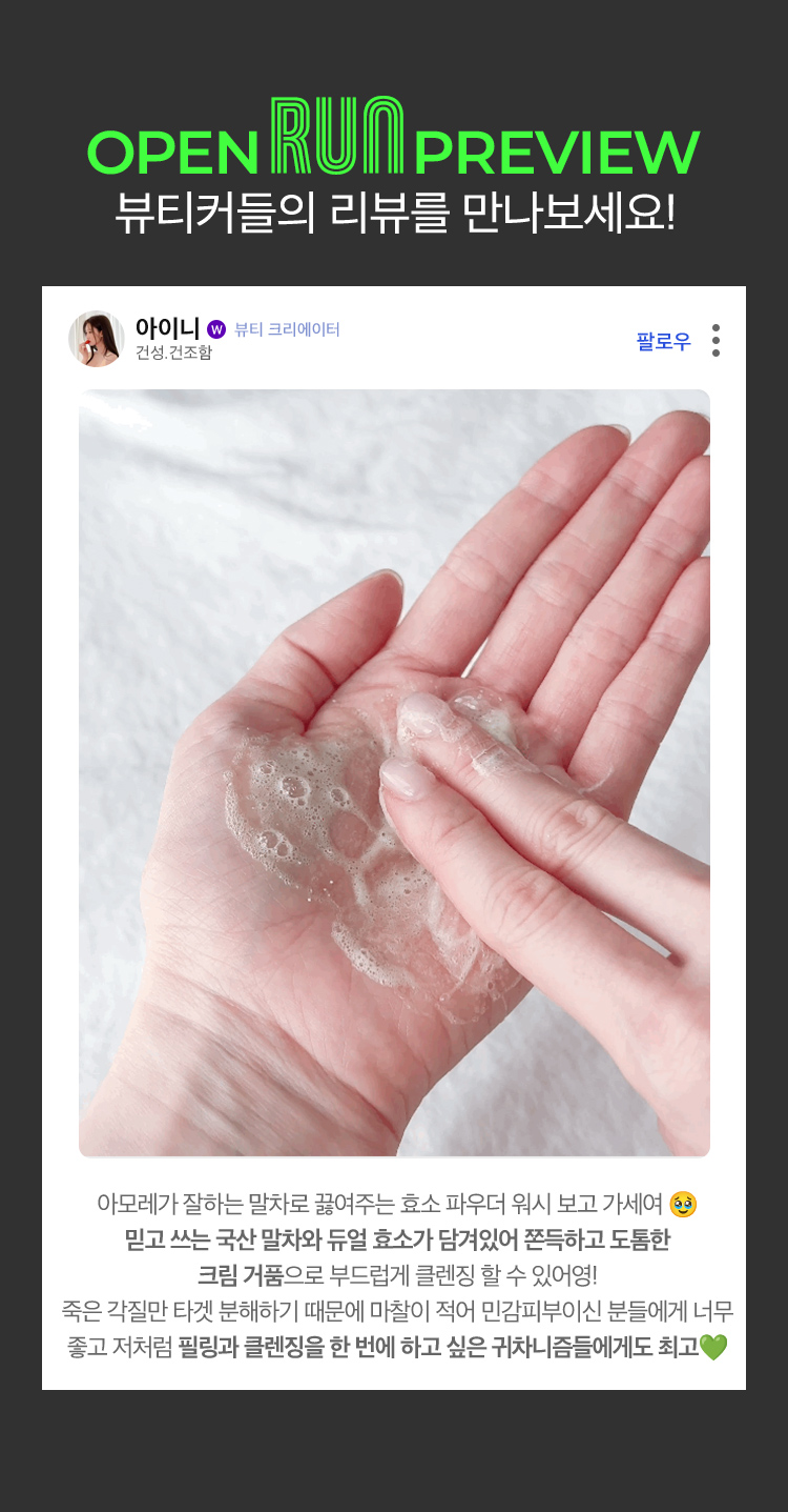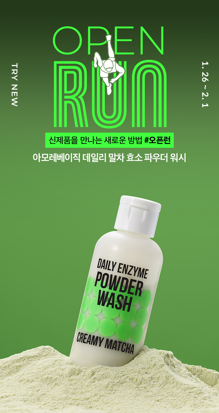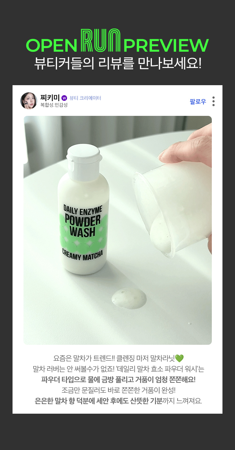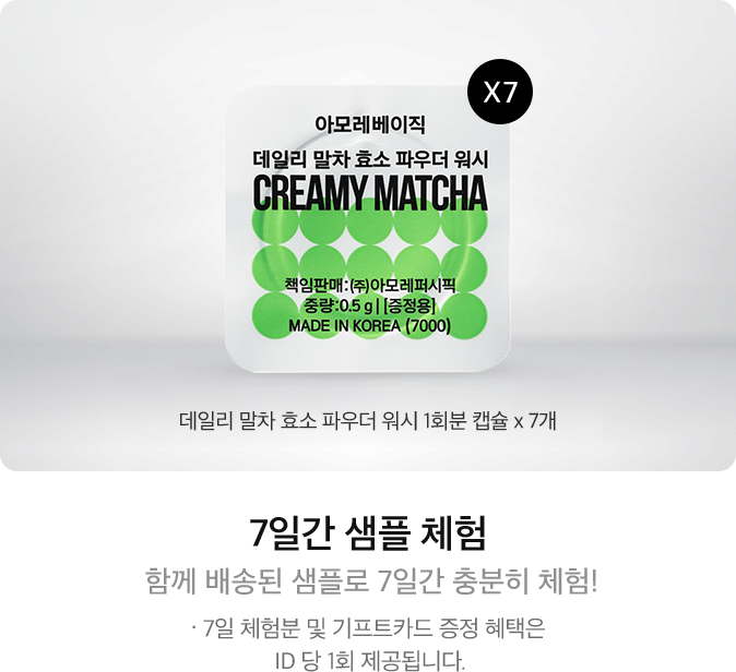 오픈런 혜택 체험용 샘플은 데일리 말차 효소 파우더 워시 1회분 캡슐*7개입니다.