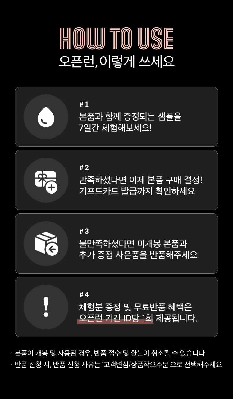 오픈런 체험용 샘플은 해당 상품에만 제공되며 주문당 1회 / id당 1회만 제공됩니다.