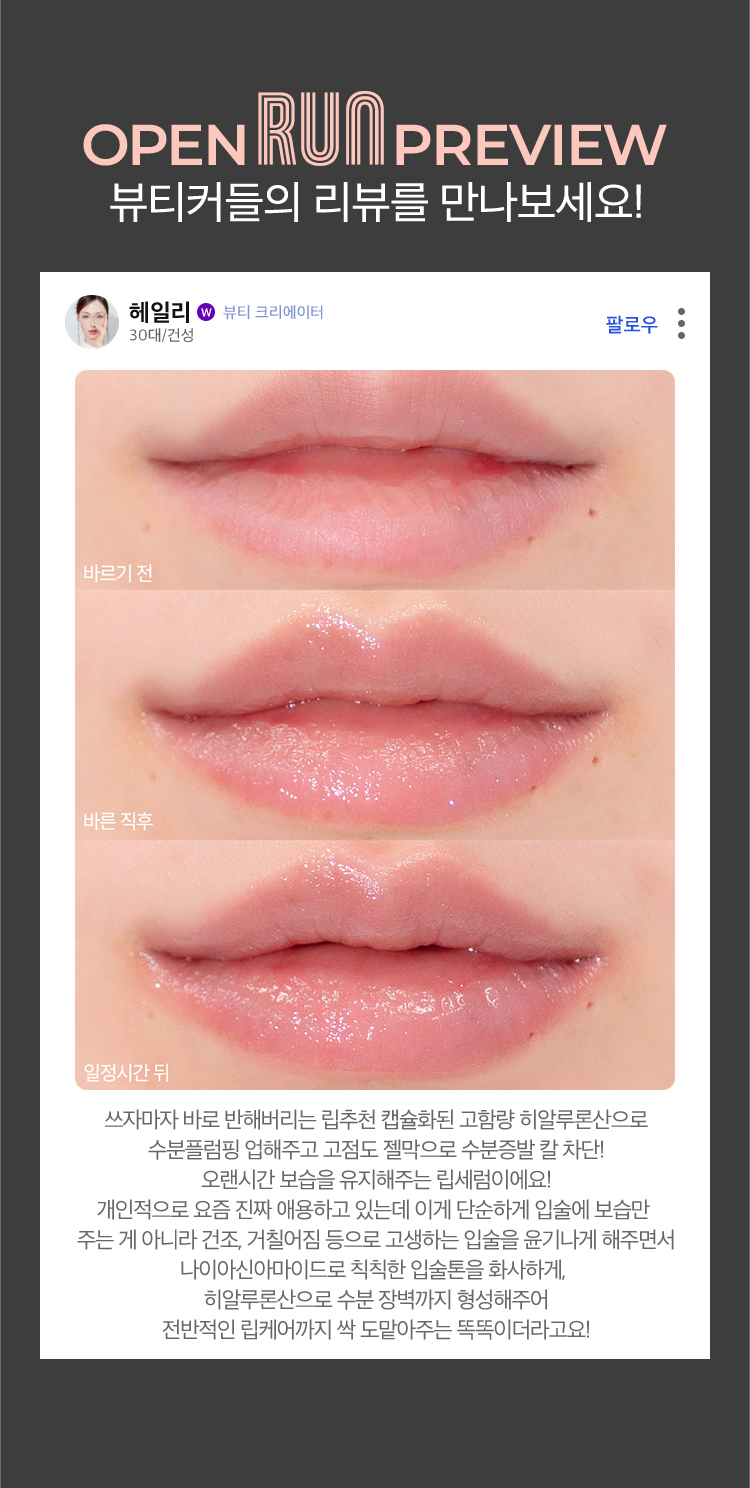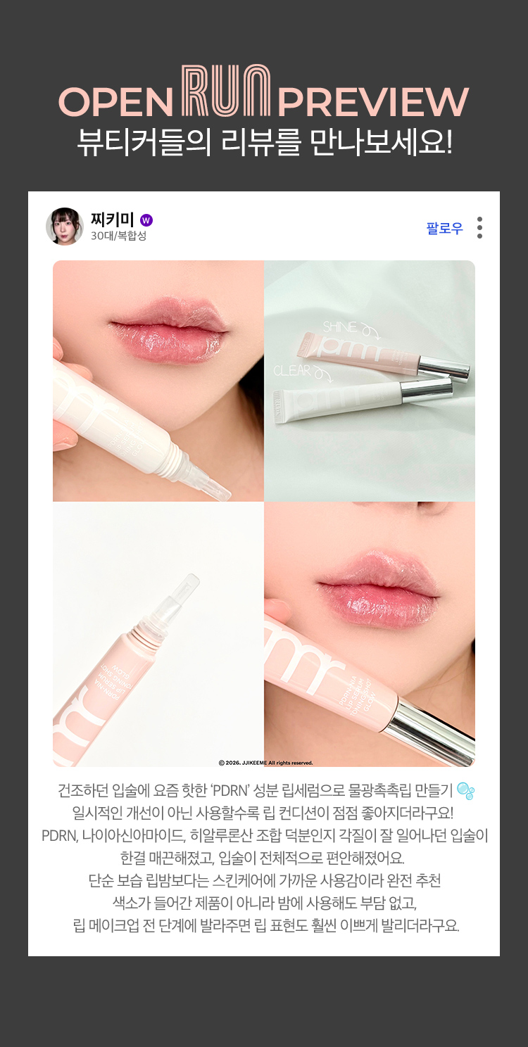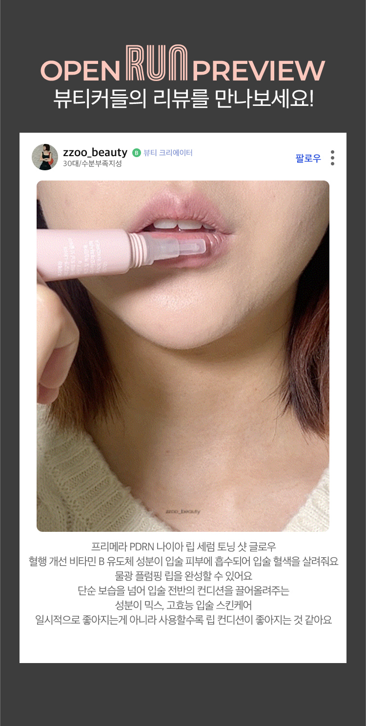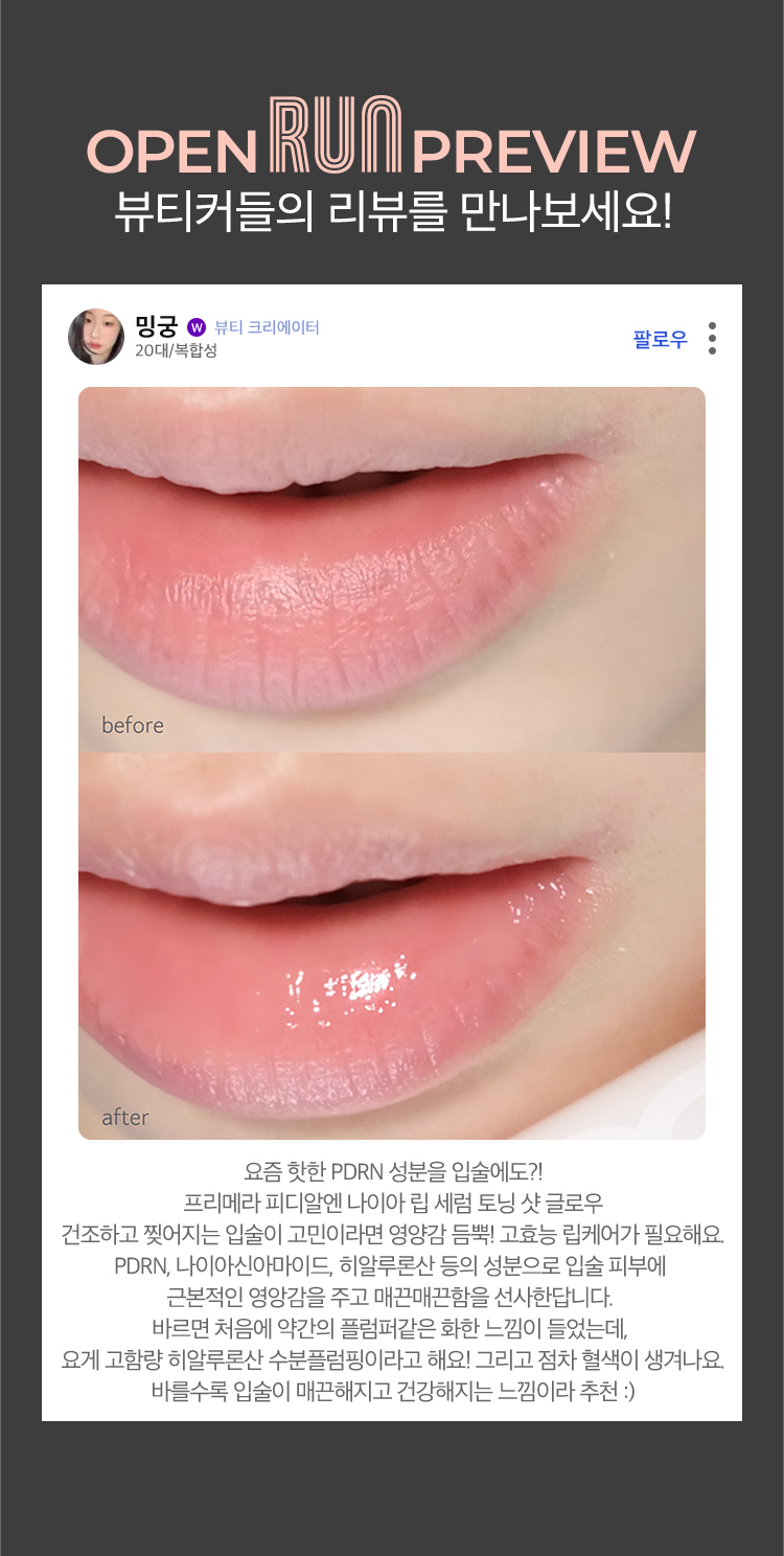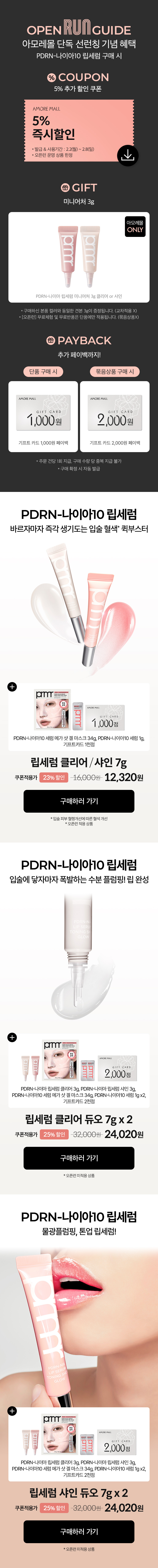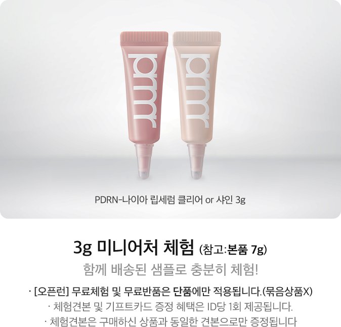 오픈런 혜택 체험용 샘플은 PDRN-나이아 립세럼 클리어 or 샤인 3g 입니다.