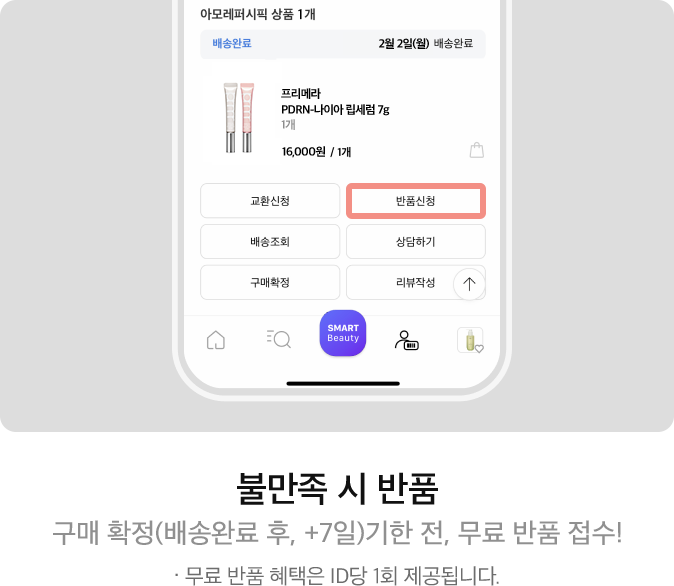 반품 신청은 배송완료일+7일까지로 구매확정 완료 이후에는 신청하실 수 없습니다.