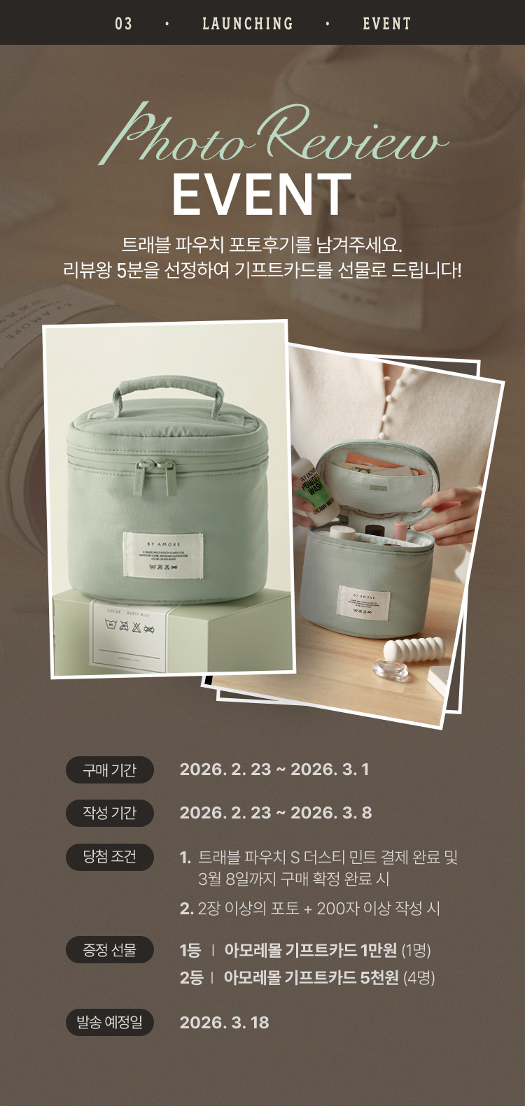 리뷰이벤트는 이벤트 기간 내 대상 상품 결제완료 및 3월8일까지 구매확정 완료 후, 포토 2장을 포함하여 200자 이상의 리뷰작성자 중 추첨선정됩니다.