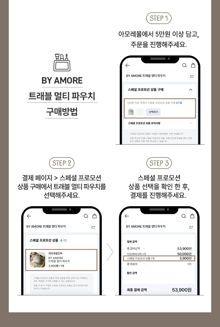 트래블 멀티파우치는 특가 구매 조건 충족 시, 결제 단계에서 직접 추가 선택하셔야 하며, 주문 완료 후 주문상세에서도 적용여부 재 확인이 가능합니다.