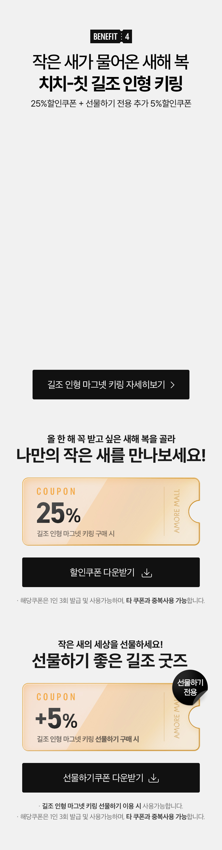길조 키링 선물하기 쿠폰은 선물하기시에만 ID당 3회 사용가능하며, 타쿠폰과 중복사용이 가능합니다.