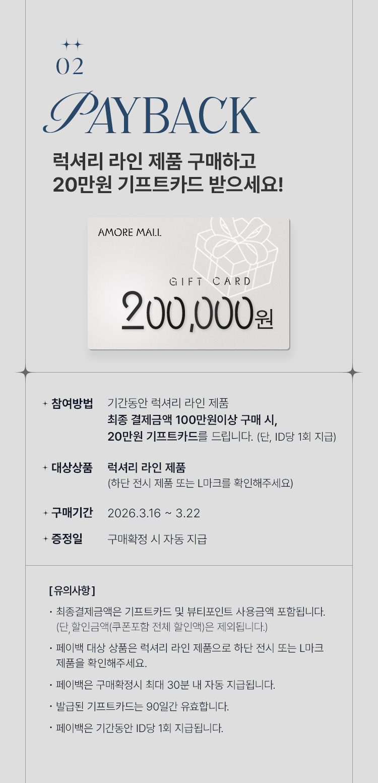 한 주문번호에 럭셔리 제품(하단 전시제품 또는 L마크 확인)의 최종결제금액 기준 100만원이상 구매시, 20만원 기프트카드 페이백됩니다.