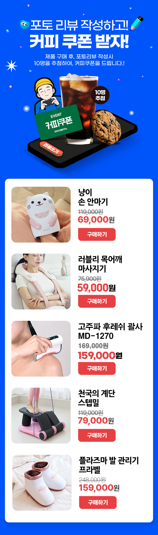 대상상품: 냥이 손안마기, 러블리 목어깨 마사지기, 고주파 후레쉬 괄사, 천국의 계단 스텝밀, 플라즈마 발관리기 프라벨