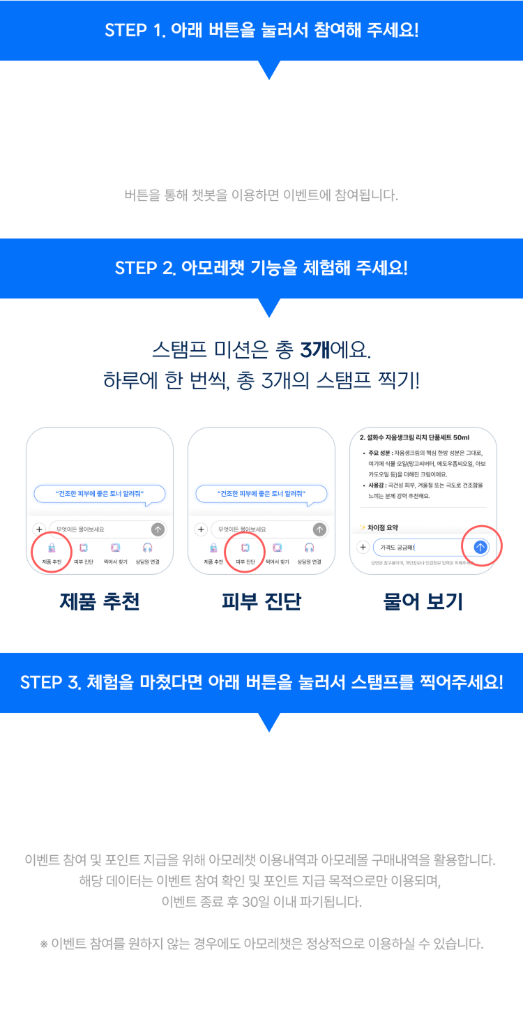 아모레챗 서비스 이용 데이터와 아모레몰 구매이력을 활용하여 이벤트 참여 여부 및 뷰티포인트 지급 대상 확인에 활용됩니다.