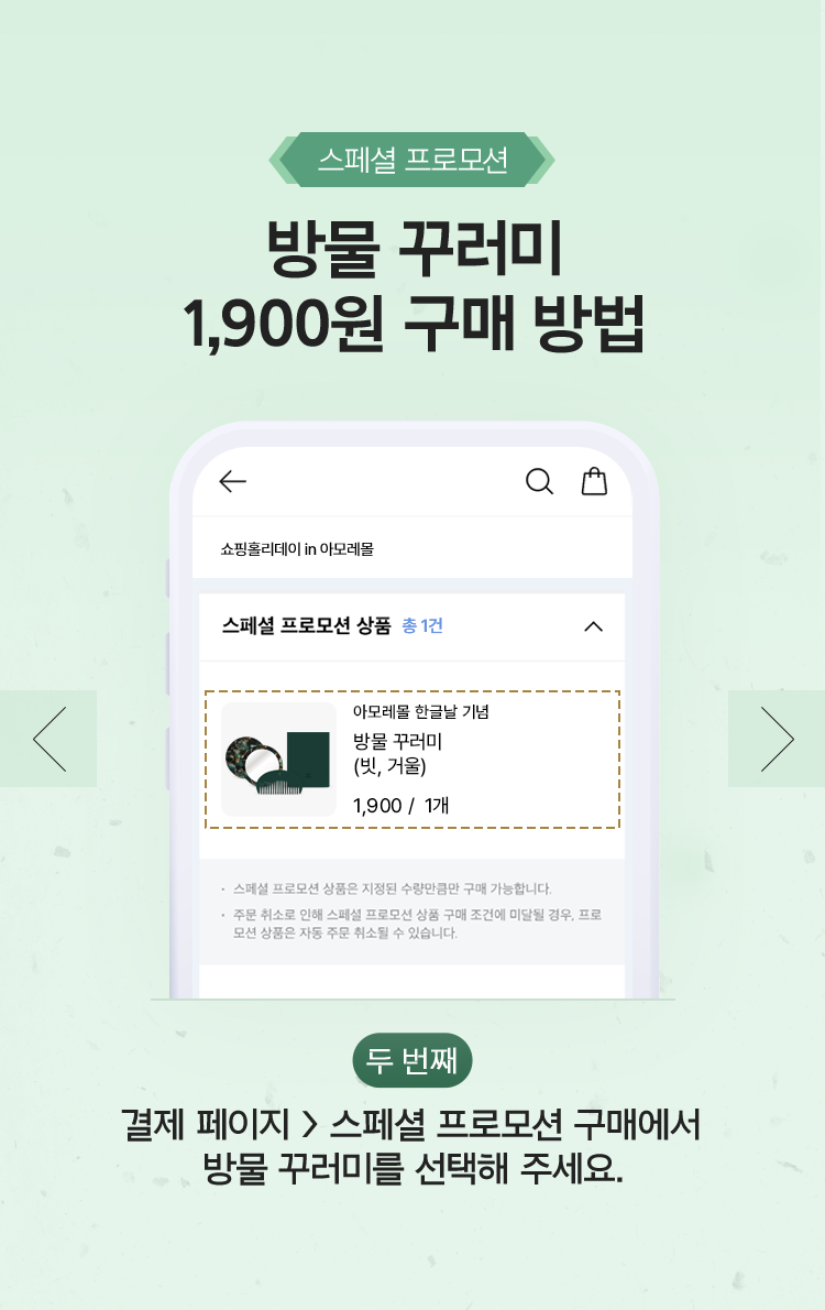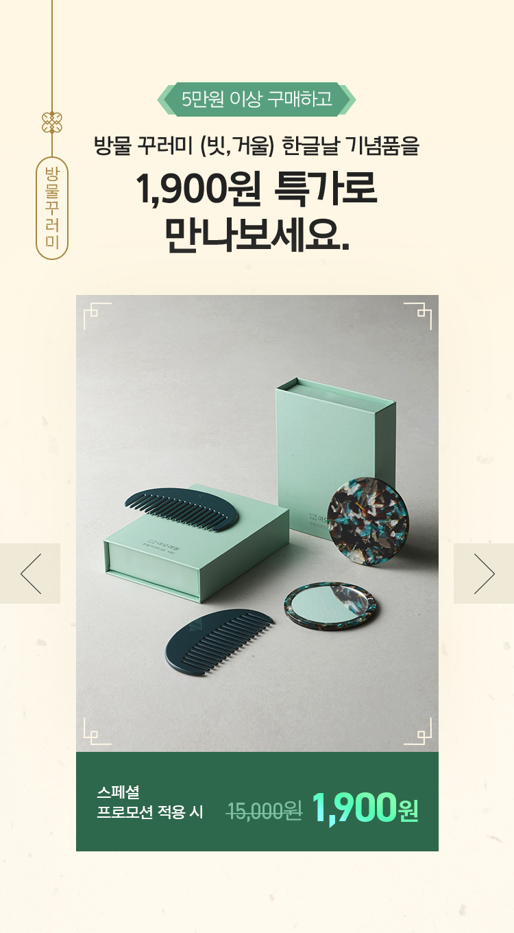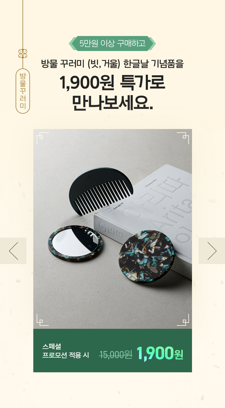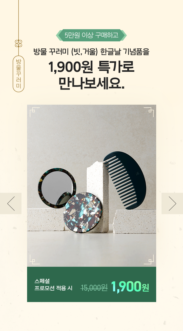 방물꾸러미(거울, 빗)은 아모레몰 5만원 이상 구매시, 스페셜 프로모션 할인가 1,900원 결제로 받으실 수 있습니다.