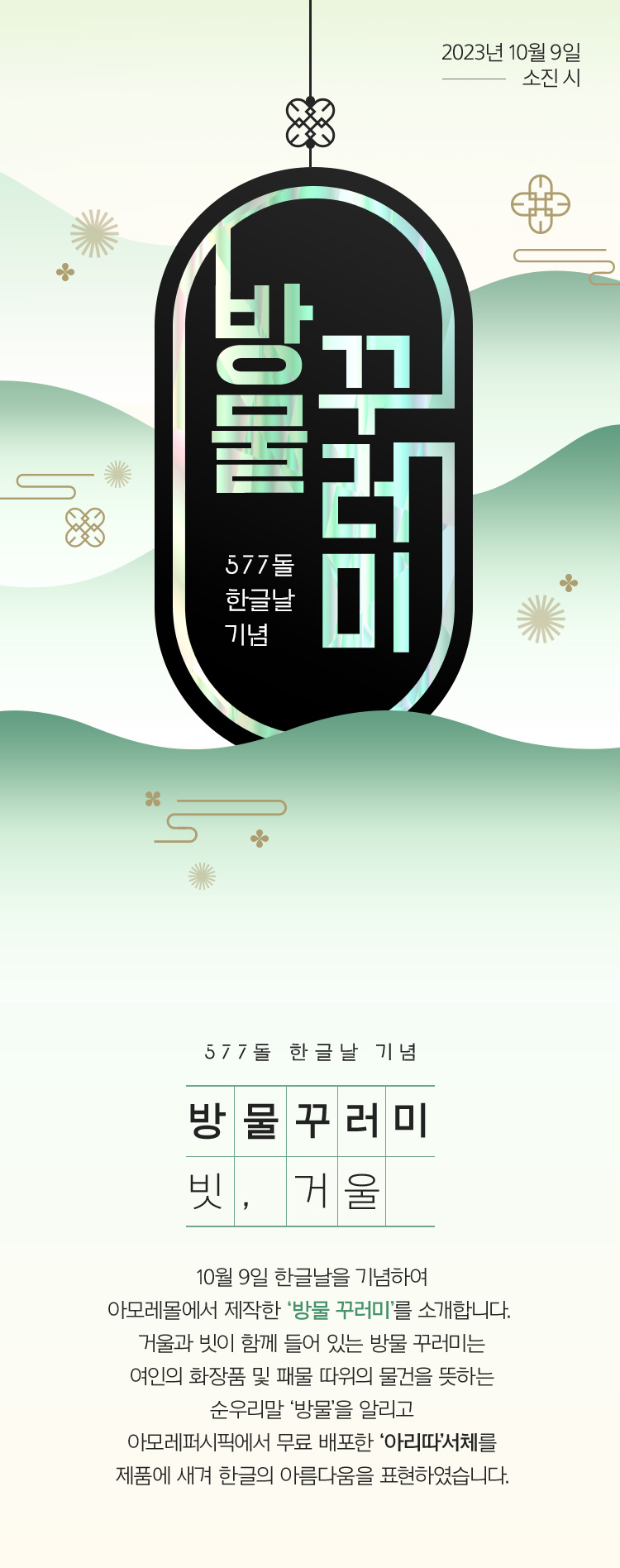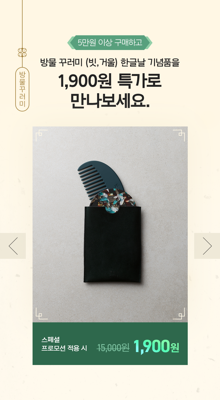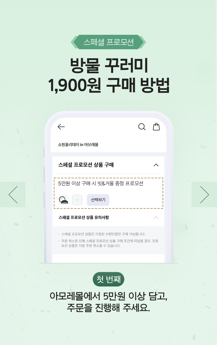 방물꾸러미(거울, 빗)은 아모레몰 5만원 이상 구매시, 스페셜 프로모션 할인가 1,900원 결제로 받으실 수 있습니다.