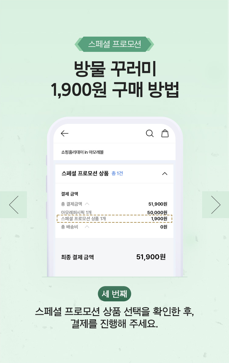 방물꾸러미는 특가 구매 조건 충족 시, 결제단계에서 추가 선택하셔야 하며, 최종 적용여부를 직접 확인할 수 있습니다.